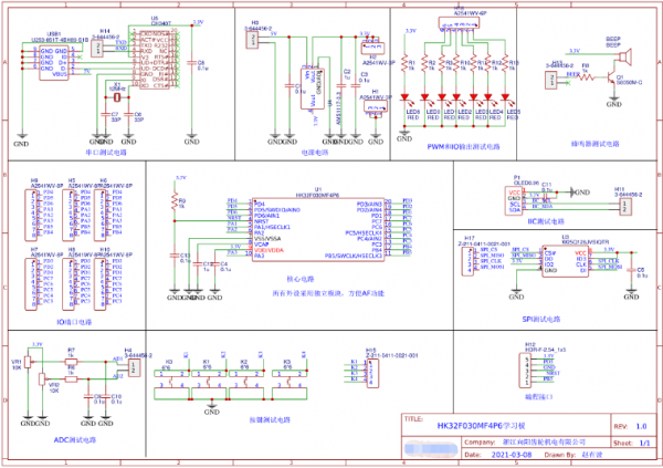 以HK32F030M单片机为核心,测试此单片机外设,并可以做为HK32F030M的开发板使用,功能特色