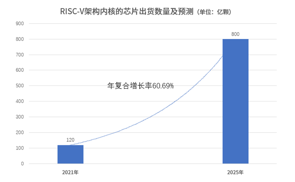 出货量方面,据 RISC-V International的首席执行官Calista Redmond透露,2021年基于RISC-V架构内核的芯片出货数量已达到120亿颗,预计未来4年将维持60.69%的年复合增长率,到2025年出货量将达到800亿颗。事实上,达到100亿的里程碑并不是件容易的事,要知道如日中天的Arm经过了17年才达到这个成就,而RISC-V架构仅用了12年就实现了。