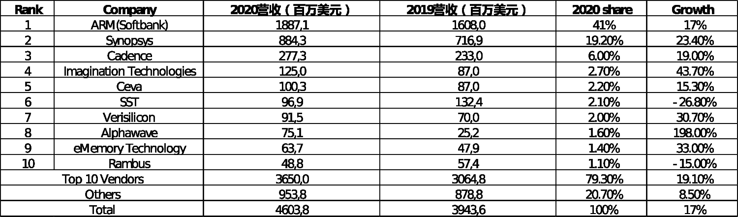 图:全球10大芯片IP公司(资料来源:IPnest 2021.4)