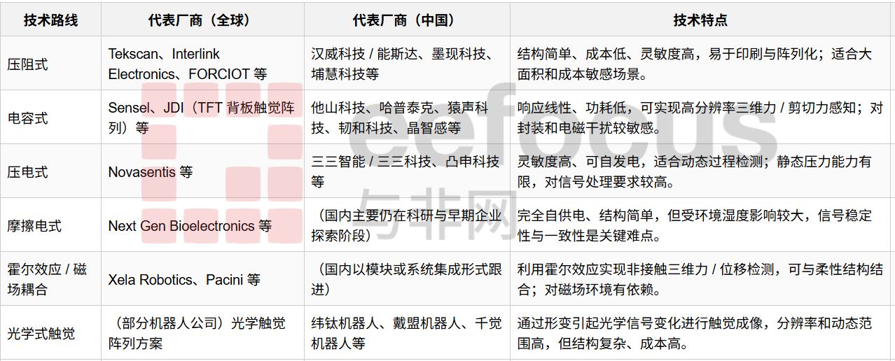 按照技术原理,柔性触觉传感器主要包括压阻式、电容式、压电式、摩擦电式、光电式等技术路线。不同路线在灵敏度、功耗、成本和环境稳定性之间进行“多目标权衡”: