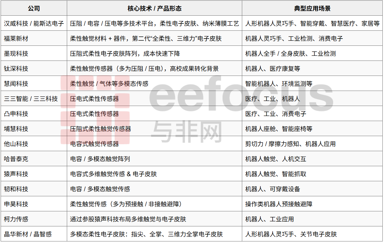 柔性(触觉)传感器主要供应商汇总(中国),来源:与非研究院整理