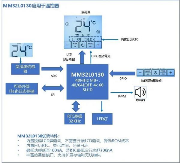 软硬件配套方面,MM32L0130 配置完善的 SDK 和 LCD 驱动代码,提供产品级参考设计,包括段码遥控器、家用温控器等参考设计,提供低功耗设计应用笔记。