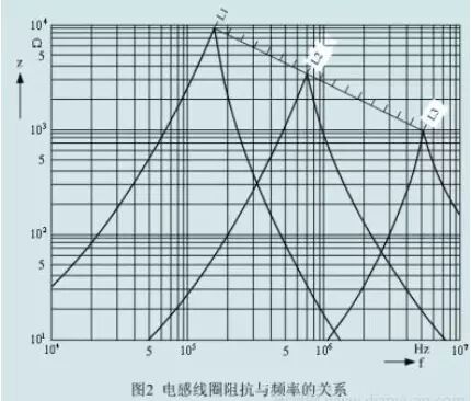 图2是普通电感线圈的阻抗与频率的关系图,由图中可以看出,电感线圈的阻抗开始的时候是随着频率升高而增大的,但当它的阻抗增大到最大值以后,阻抗反 而随着频率升高而迅速下降,这是因为并联分布电容的作用。当阻抗增到最大值的地方,就是电感线圈的分布电容与等效电感产生并联谐振的地方。图中,L1 > L2> L3,由此可知电感线圈的电感量越大,其谐振频率就越低。从图2中可以看出,如果要对频率为1MHz的干扰信号进行抑制,选用L1倒不如选用L3,因为 L3的电感量要比L1小十几倍,因此L3的成本也要比L1低很多。