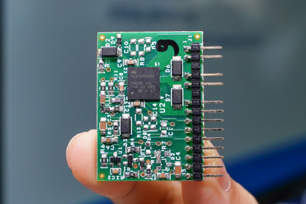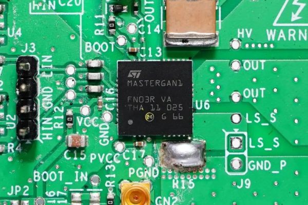 图为ST MasterGaN1的评估板,连接为半桥输出,左侧为驱动信号输入,右侧为半桥输出,左侧下方是一颗稳压器,为MasterGaN1提供稳压供电。