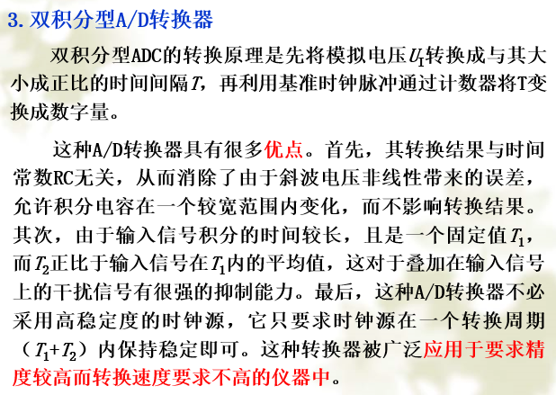 双积分型 ADC:属于间接型 ADC,它先对输入采样电压和基准电压 进行两次积分,以获得与采样电压平均值成正比的时间间隔,同时在 这个时间间隔内,用计数器对标准时钟脉冲(CP)计数,计数器输 出的计数结果就是对应的数字量。双积分型 ADC 优点是抗干扰能力 强;稳定性好;可实现高精度模数转换。主要缺点是转换速度低,因此这种转换器大多应用于要求精度较高而转换速度要求不高的仪器 仪表中,例如用于多位高精度数字直流电压表中。
