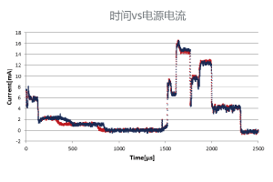 第2个例子,我们从2014年开始批量生产Wi-Fi等的射频市场用的高精度晶体谐振器,进行要求总频率精度在±20ppm以下设备的IC匹配服务。射频市场以智能手机等电池驱动的组装产品为主流,组装产品厂商和IC厂商为了让电池尽可能用得久一些而在短时间工作的低耗电化上下力气。图5显示BLE模块中的μS时标的消耗电流的测定结果。BLE厂商和IC厂商以这些数据为参考来决定他们使用多少频率或多大尺寸的晶体谐振器。